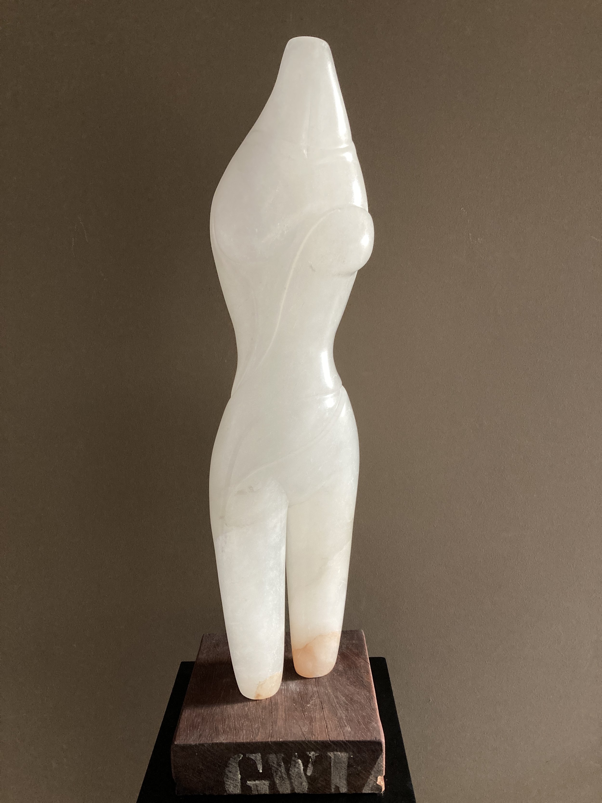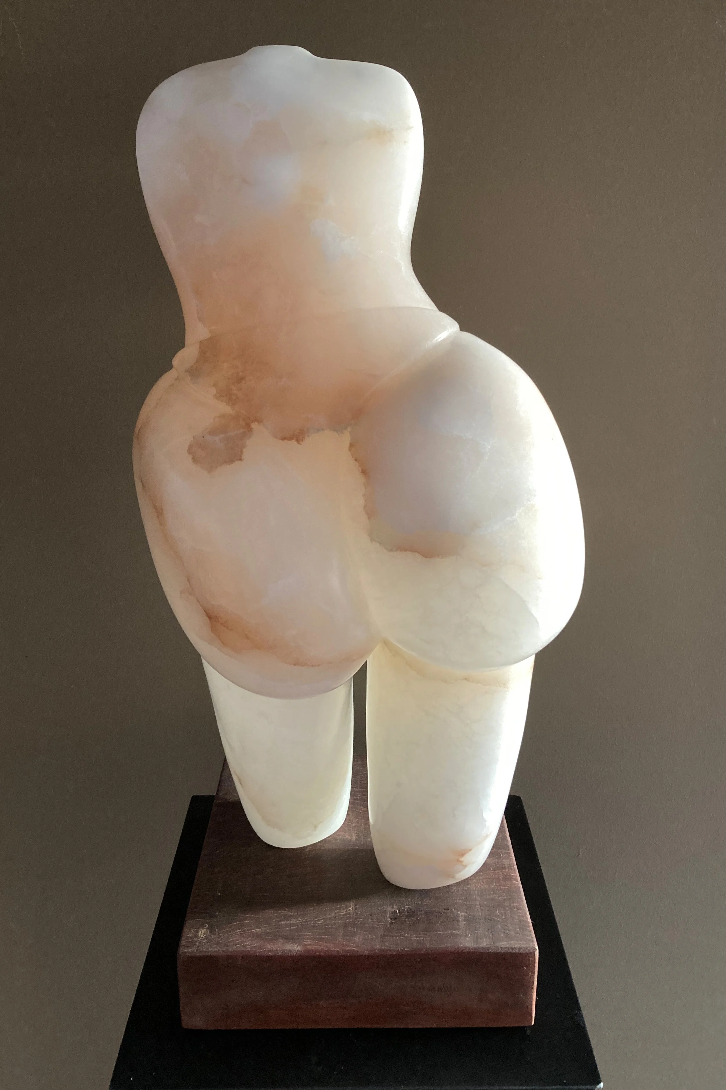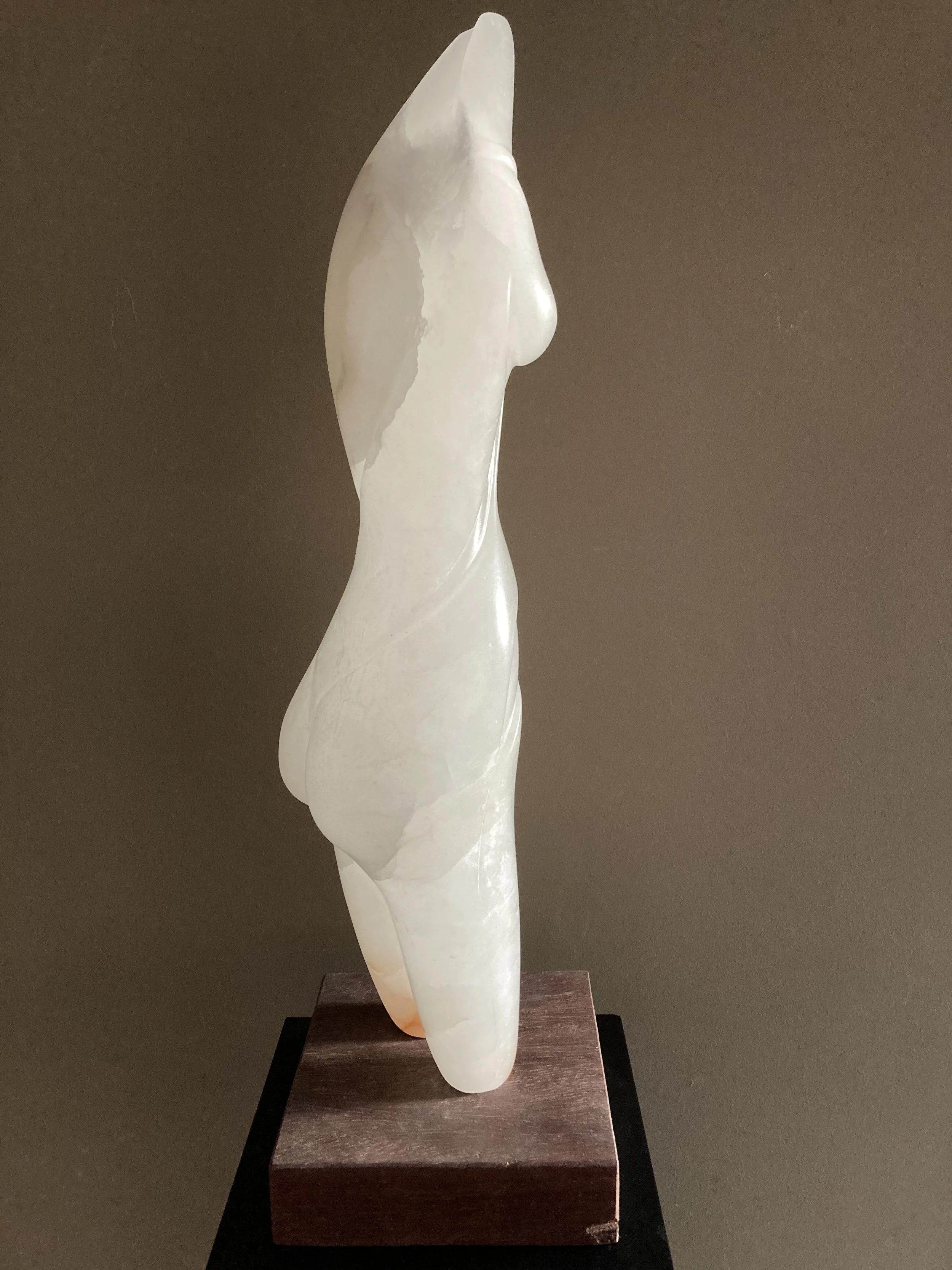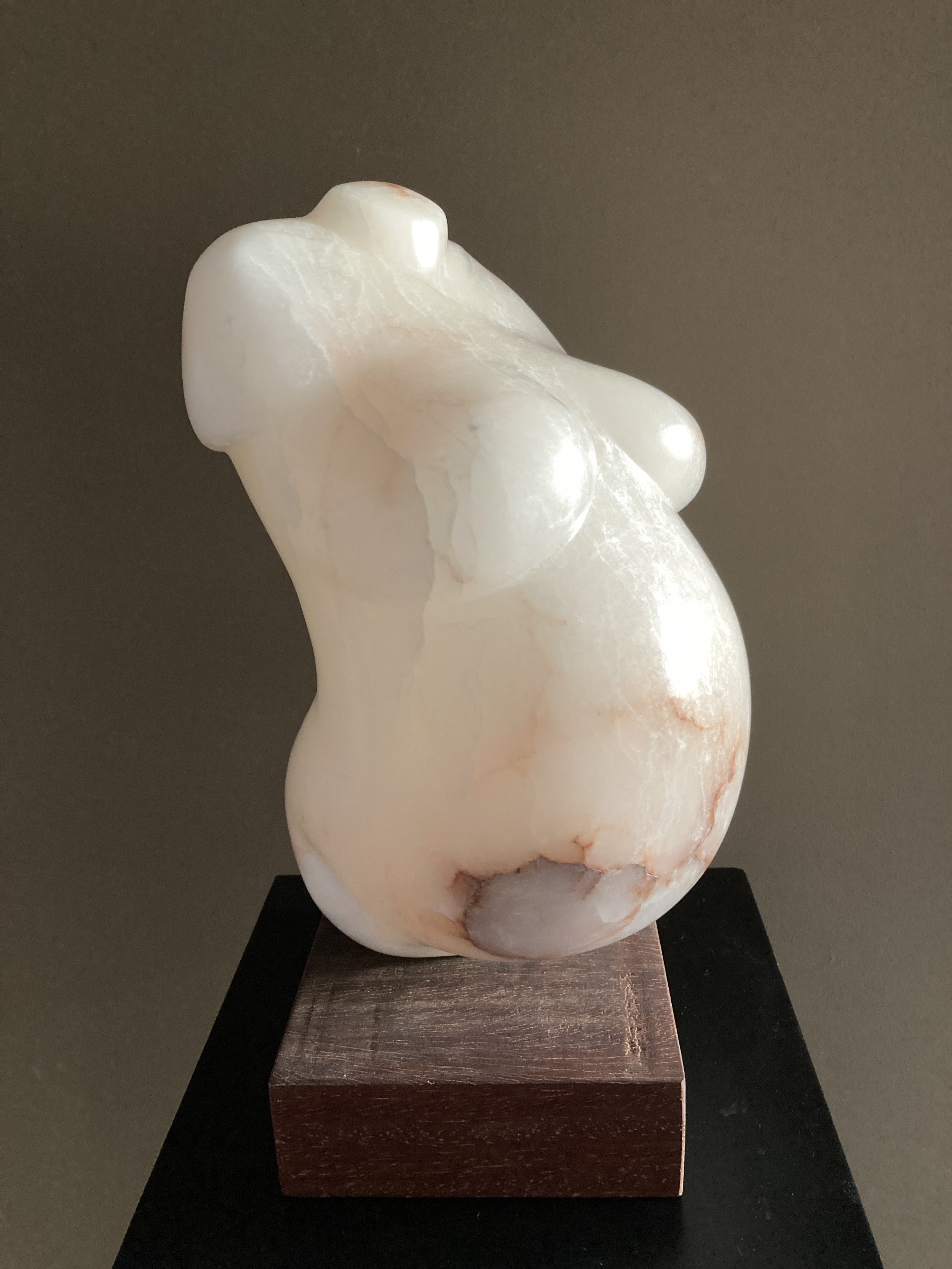 Wit albast met rode sporen op sokkel van Wengé hout.